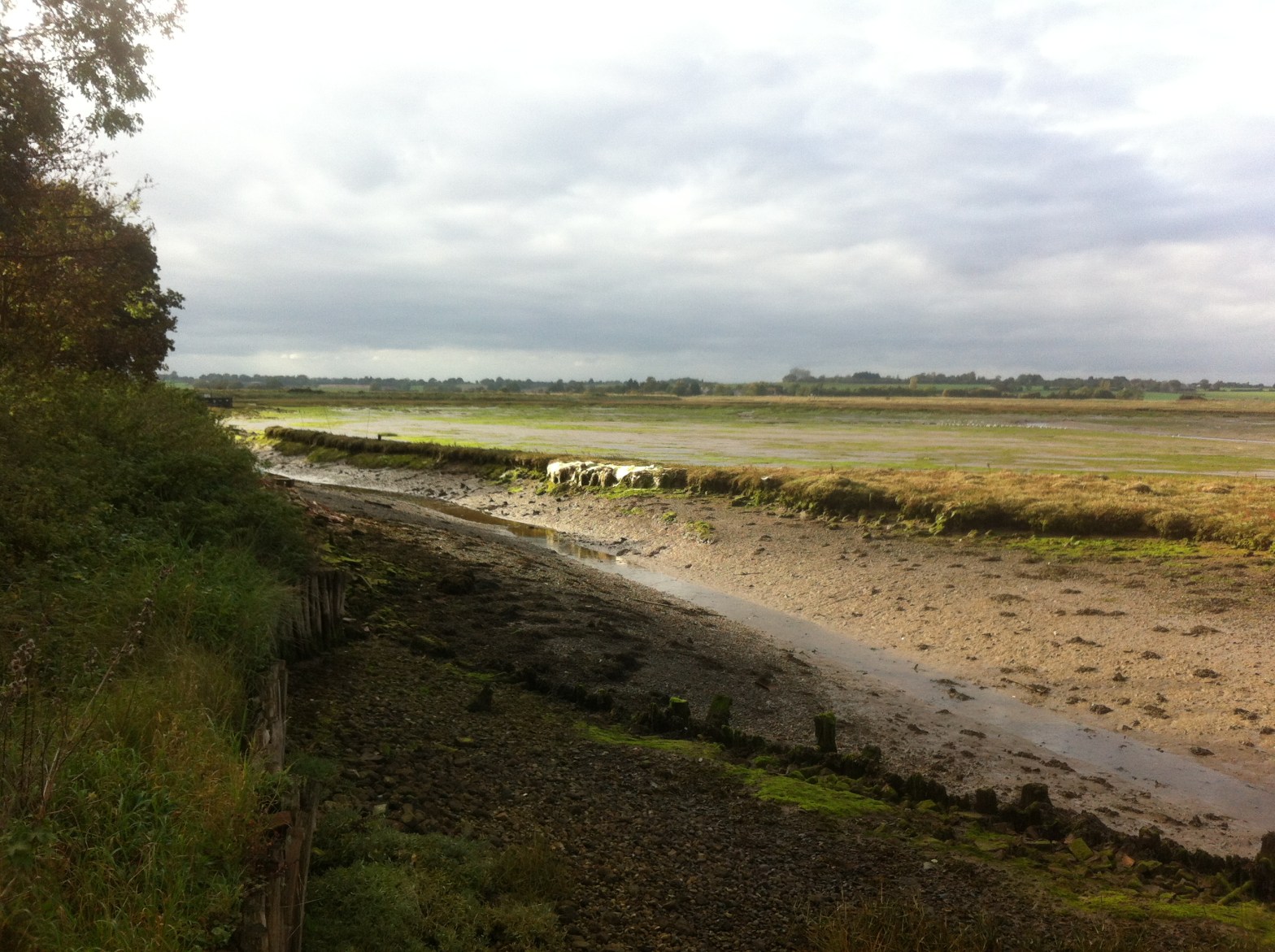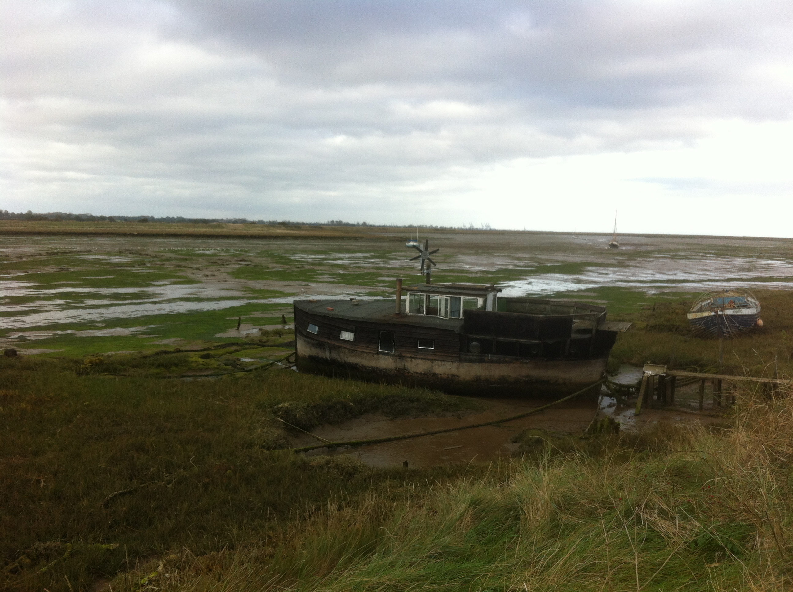 As I walked the weather changed, the light catching the flats beneath, whilst the trees and scrub on the shore cast darker shadows in other areas. When I returned to the beginning, by the base and foundations for an old mill, the rain began to fall, the cold wind blowing it into my face. Autumn is definitely here. The connection between people and this particular landscape is ancient but time has enabled each, at least in my view, to complement each other. The man made sea walls lie side by side with the saltings; the boats and telephone wires straddle the mud flats but do not impose their will, merely sharing the space with the curlew, snipe, gull and goose. This place was part of the setting on Arthur Ransome’s ‘Secret Water’, a place which he knew intimately. It is easy to see how he could be influenced and how the romanticism of the place could instil such a desire to write.
